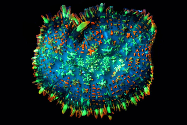 Mushrooms corals have photosynthetic algae in their cells, providing them with a lot of extra energy from sunlight and lighting given by our LEDs. However, they do love to eat – feeding them will help increase their color, overall health and encourage them to breed and spread. We see lots of growth and splitting of our Mushrooms from feeding. Some things you can feed live coral Mushrooms include: