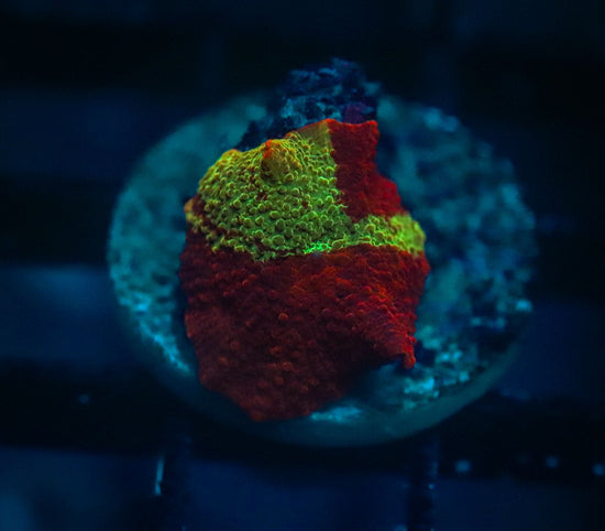 Most Mushrooms corals are generally forgiving and/or tolerant of different lighting conditions. You'll be able to place them almost anywhere except the most shaded or brightest positions in your tank. However, Mushroom coral is quite sensitive to sudden changes in light intensity, so it's important to first place them at the bottom of your tank or in a corner during the acclimation process and slowly move them up. We like to keep these mushroom corals in around 50 par. Light spectrums also give a large benefit too with our tanks heavily favoring blues. Here at Koralkingdom we give them mostly blue light with about 2 hours of white, green, and red. When it comes to the Mushrooms for sale here at Koral Kingdom, we suggest giving them moderate lighting by placing them in the middle to top range of your saltwater aquarium. After a slow and steady acclimation, you could also place them higher in the water column, as live coral Mushrooms are known to show off their eye-popping colors in quality lights. We keep these corals under a verity of lights which include Aqua illuminations, Orphek Leds, Radions, and even the in expensive black boxes. Be careful not to introduce them too quickly.
