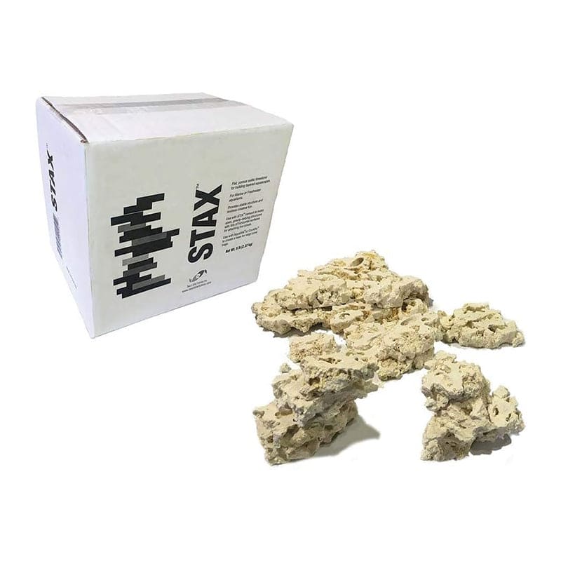 Build striking, unique aquascapes in your aquarium with Two Little Fishies STAX Aquascaping Rocks. STAX are flat, porous, oolitic limestone shapes, perfect for building layered aquascapes in marine or freshwater aquariums. Provides a stable structure and limitless creative fun! Each STAX rock is cut so that it has flat surfaces on both sides, allowing for easier and more secure stacking. STAX are made from 100% natural, sustainably collected limestone -- no chemicals or additives to worry about. These pest-free, reef-safe rocks are ready to go into your aquarium. Use with STIX cement to make open, gravity-defying structures, caves, ledges, and overhangs with lots of horizontal surfaces for attaching live corals. Used with AquaStik or CorAffix, STAX are also the perfect base for coral frags. . Most of the pieces range in size anywhere from 3" x 4" to 4" x 6". STAX rocks are ready to use, no curing necessary. Offering is for 5lbs of STAX.